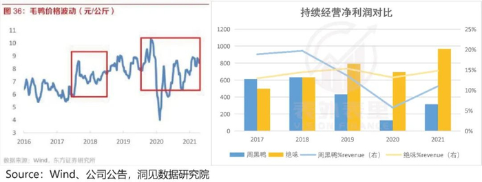 此外,原材料成本上,从持续经营净利润来看,2018年、2021年毛鸭价格普涨时,绝味受原材料波动的影响,相对更小一些。