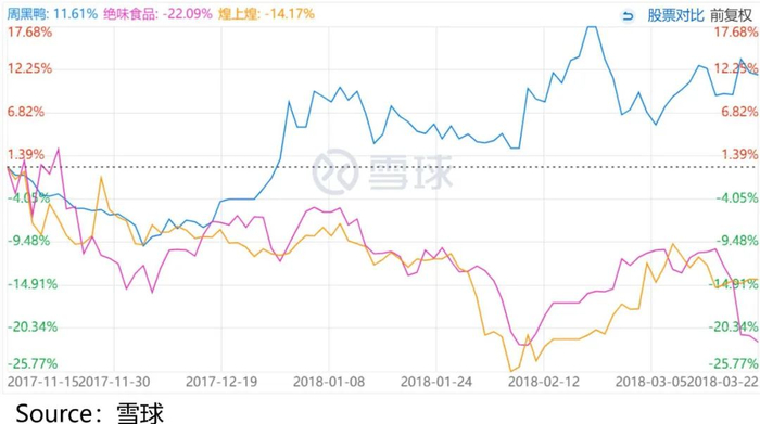 高端化模式跑通传达出积极信号,投资人信心大增,2017H2-2018H1,周黑鸭股价在行业下行周期,逆势上涨。