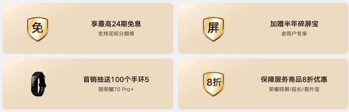 每逢新机发布,荣耀商城都会推出丰厚的预订和购机福利。针对荣耀70系列,荣耀商城特推出24期免息、老用户下单赠送半年荣耀碎屏宝、618期间预订/购机享受荣耀碎屏宝、荣耀意外宝、荣耀延长宝等产品8折购买权益。此外,购荣耀70系列还赠天涯明月刀手游道具。6月16至18日,还将每天抽送150个定制龚俊帆布袋。此次荣耀70 Pro+正式开售,更有抽送100个荣耀手环5,前100名付尾款赠329元耳机等系列福利。