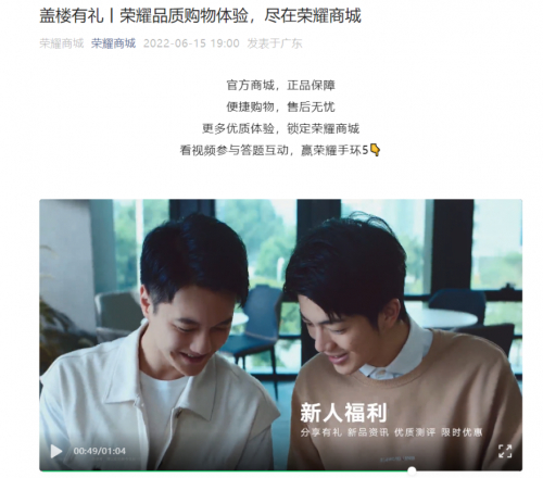 近日发布的荣耀商城品牌TVC中,全面呈现了荣耀商城的全场景产品购买服务和全流程品质购物体验。荣耀商城打通线上线下购物体系,提供正品和无忧售后保障;其拥有成熟的会员体系,VIP用户可享受专属客服、8折购物服务权益、优先发货等专属权益;个性化购物趋势下,荣耀商城支持镭雕和礼盒包装等定制服务;针对企业用户,还可定制软硬件定制、专属客服等品质服务。越来越多的消费者将荣耀商城推荐给他人,荣耀商城还推出了分享有礼的活动来回馈用户。