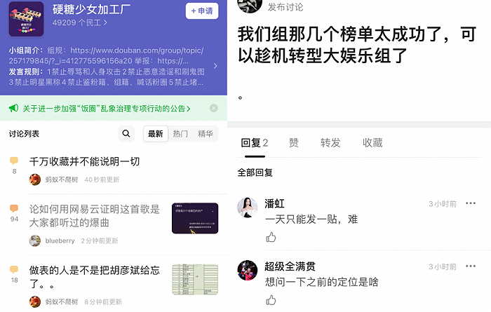 艺人社区里,用户日常最大爱好是“踩对家”;综合小组里,用各维度指标排列组合地PK各路明星,是绝不会错的保底热帖。后者促成了豆瓣鹅组、百度g-music吧等颇具站外影响力的娱乐大组,他们常年热衷举办“明星比较大会”。有些意外的是,如今这波“自制野榜”的出产地,却来自一个纯纯的艺人小组。