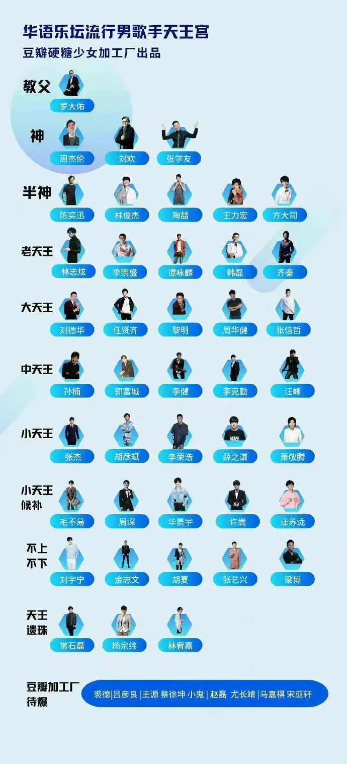 比如“华语流行男歌手天王宫”把男歌手们分为教父、神、半神、老天王、小天王、豆瓣加工厂待爆等,一档音综就可拿此榜单去考量拟邀嘉宾,若有足够预算能请到教父或神级别的歌手,无疑能对节目看点产生质的影响,或者音综要扩充受众,就可综合考虑邀约各梯级歌手上节目,既要照顾老观众请些老天王歌手,也要为新世代观众着想请些待爆、有潜质的新世代歌者。