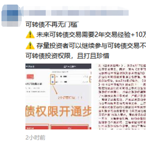 另外,记者注意到,一些券商营业部人士6月17日晚上发布朋友圈,提示尚未开通可转债交易权限的投资者在门槛尚未提升之前及时开通。