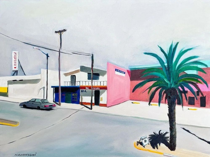 与上文中的创作《广场恐惧症旅行者》的肯尼相似,同样是利用谷歌街景进行创作的日本艺术家辰巳菜穗,也通过谷歌街景周游世界,选取一些风景作画。乍看之下,她的画作似乎只是将她选取的街景截图再创作成油画,但其实辰巳的画作中有一些隐藏的小“彩蛋”,她会原封不动地画出谷歌街景中一些弯曲的电线杆,又或者是变形的招牌等,并借此提醒大家,谷歌街景终究是信息数字化后的图像,并非真实的世界。
