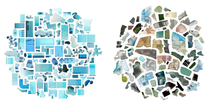 街景还为“收集癖”提供了方便,不管是由丁仁(Ding Ren)和麦克·卡拉比诺斯(Mike Karabinos)开始的《谷歌“羊”景》(Google Sheep View),专门收集世界各地街景中羊的图像,还是在街景上收集环岛雕塑的中国摄影师、设计师杨潇,将篮球场或游泳池等人造场地从地图中提炼出来,并进行拼贴组成了奇特的画面的艺术家詹妮·奥德尔(Jenny Odell)。谷歌地图和街景的诞生,为这些创作提供了更为便捷的资料来源,更重要的是,也提供了一种独特的观察世界的角度。