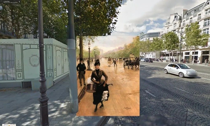 2014年,谷歌街景的PC版新增添了虚拟“时光机”(Time Machine)功能,用户们可以倒转时光,观看某一建筑、街道或城市的变化。人们开始注意到街景可能包含的一种关于过去与未来的历史维度。基于这一功能的启发,艺术家哈莉·多切蒂(Halley Docherty)创作了一系列作品,将世界名画和历史上的著名照片镶嵌在同样位置的现代街景之中,制造了一种超越时空的对话的可能。