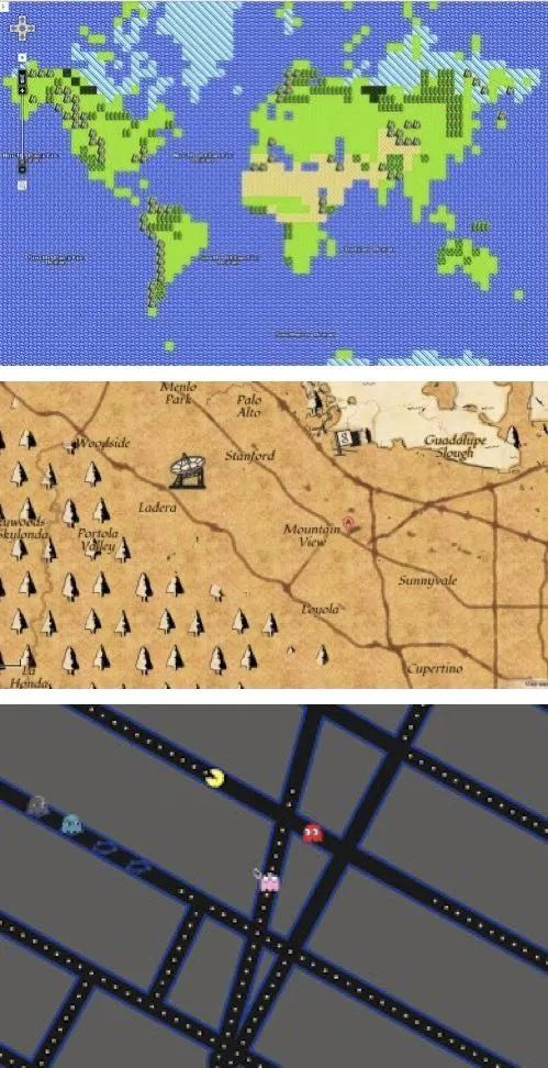 除此之外,街景提供的虚拟游览,还为进一步娱乐化提供了舞台。2012年4月1日,谷歌推出了水下搜索及“8比特探索地图”。顾名思义,地图上的街景都变成了8比特像素画面的怀旧显示,其中大城市以城堡表示,其他城市以村庄表示,众多著名建筑都有特别的绘图。在之后的几乎每个愚人节,谷歌都会基于地图和街景推出风格各异的娱乐化版本。如2013年的复古感觉的藏宝图地图版本,以牛皮纸手绘风格亮相,点击则可看到老照片风格的街景图。2014年,谷歌于智能手机的谷歌地图APP推出“神奇宝贝训练师专用地图”,150种不同类型的神奇宝贝分布于世界各角落,供用户抓取,曾在世界各地掀起热潮。2015年的“吃豆人(Pac-Man)地图”则让人们在真实的地图下体验吃豆人游戏。