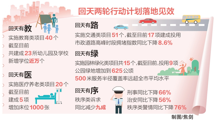 市政道路高峰时段拥堵指数同比下降8.6%,背后是51个交通工程悉数启动,提速、疏堵;2000余个像清华附小、人大附中的名校学位,让孩子既要“有学上”也要“有好学校上”;短短4年公园绿地就增加到625公顷,500米服务半径覆盖率远超全市平均水平……