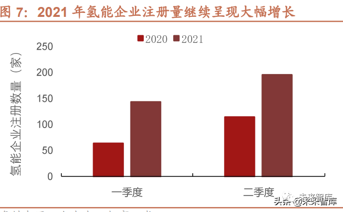 政策的倾斜也带来氢能产业的蓬勃发展。2018 年以来相关公司的注册量呈 现大幅度增长,由 2018 年 243 的注册数上升至 2019 年 416 的注册数,且 2021 年继续保持良好态势,一季度氢能 企业的注册量达到 143,同比 2020 年同期增长了 123%,二季度氢能企业的注册量达到 196 家,同比增长了 70%。