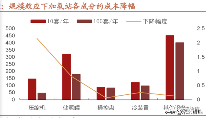 在规模效应下,加氢站的设备成本也将呈现不断下降的趋势。加氢站的总投资成 本也将下降 26.7%。由此可见,规模效应显著提高了加氢站建设的经济性,且设备端的降本空间极大,更是加氢站普 及应用的重中之重。