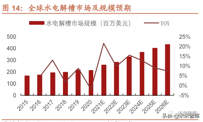 2019 年,全球碱性电解器在全球水电解市场中占 据了 58%的份额,到 2026 年,该产品细分市场的规模有望从 2019 年的 1.48 亿美元增长至 2.26 亿美元,与此同时, 整体水电解槽市场规模将达到 4.31 亿美元,碱性电解槽的占比将下滑至 52.4%。预计到 2050 年,碱 性电解槽和 PEM 电解槽的能源转化率将分别达到 78%和 74%,PEM 电解槽的规模占比达到 40%,设备价格将降低 到 800~2000 元/kW,碱性电解槽的价格降低到 600~1000 元/kW,届时电解水制氢的比例也将达到 70%,装机量大 于 500GW,市场规模大于 7000 亿元。(报告来源:未来智库)