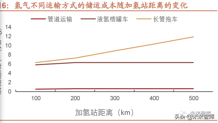 总体来说,在短距离运输中,相对成熟的长管拖车的气态运输尚有一定 经济性,然而长距离运输中,因长管拖车的氢气运输重量仅占自重的 1%,因此成本很高,只有期待氢气液化的可行 性进一步提高,从而使用液氢槽罐车运输才能更有效地降本。此外,管道运输尽管成本极低,但初期投入巨大,且初 期设备的利用率也较低,将液化气管道用来输送氢气,管道的腐蚀性和强度变化仍有待进一步研究。(报告来源:未来智库)