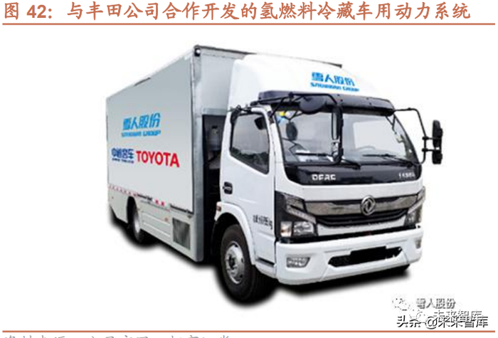 除氢能相关配套设备外,雪人股份还提供完整的氢燃料电池系统。目前已开发出 12 个型号的燃料电池系统,为克莱 斯勒、奔驰、通用、沃尔沃等众多汽车生产商提供过燃料电池系统。2020 年底,雪人宣布将在氢燃料电池领域和丰 田展开合作。日本是全球氢燃料乘用车普及程度最高的国家,而丰田是这一战略的重要执行者,从 1992 年就开始, 丰田就已经展开了对氢能源汽车的研究,甚至早于其对油电混动技术的研究。1996 年已生产出第一款燃料电池汽车。2014 年,丰田发布了量产版氢燃料电池车 Mirai,该品牌成为了氢燃料电池乘务车量产的标杆。本次合作,主要为雪 人股份引进丰田汽车燃料电池堆等零件,为国内研发制造氢燃料电池冷藏车和重卡提供解决方案,而这类车型也将是 交通运输领域预计最快实现渗透率提升的氢能车型。