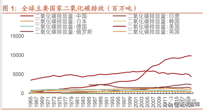 2020 年 9 月,中国宣布将在 2030 年前实现碳达峰,在 2060 年前实现碳中和。这是基于全球碳排放量在工业革命以 来显著提高的必然举措。截至 2011 年,全球已使用 52%的二氧化碳排放额度,若不采取行动,则 2045 年全球碳排 放将超标,全球平均气温上升 2 摄氏度以上,届时将对全球生态系统造成不可逆的损害。通常来看,碳排放的主要形 式来自于化石燃料的燃烧,在工业化早期,粗放式经济发展模式下,往往带来较低的能源利用率和极高的废料排放。中国的二氧化碳排放量在上世纪 90 年代以后快速攀升,到 2012 年二氧化碳排放量达到 90 亿吨,此后中国碳排放速 度放缓,2019 年累计排放二氧化碳 98.9 亿吨。