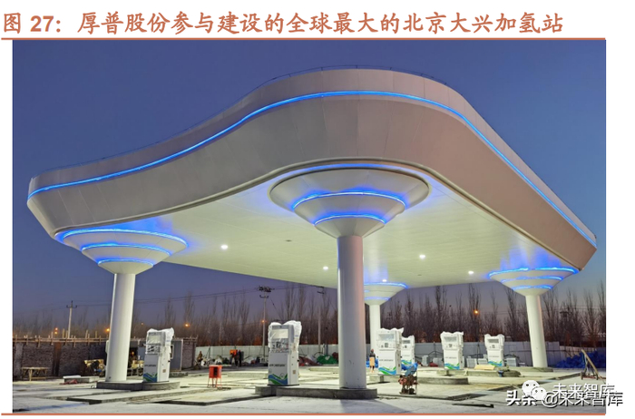 加氢机是储氢设备的重要组成部分,成本占比接近 10%。加氢机是指实现氢气加注的设备,一般装配有压力传感器、 温度传感器、计量装置、安全装置等,其工作原理和加油站中的加油枪类似,压缩后的氢气经输送管道进入加氢机, 经过各类阀门、计量器和软管,最终进入燃料电池车的气瓶中。当前国产加氢机的重要部件依然严重依赖进口,主要 为相关的管道阀门、流量计和加氢枪等,且鉴于当前国内市场应用面较窄,加氢机生产缺乏规模效应,加氢机厂商没 有进行零部件国产替代的动力,因此成本依然高居不下。国内生产加氢机主要的上市公司有厚普股份,公司的业务涵 盖车用、船用、民用、核心零部件、互联网和氢能,其中氢能相关的产品主要包括加氢机、E 系列、S 系列、C 系列 加氢站、加氢撬装设备等。当前公司已成功研发 70Mpa 的加氢机,而目前国内的高压氢气加注压力普遍是 35MPa, 单车加注量和续航里程较短;此外公司研发的氢气质量计量计已经处于样品试制阶段,成功量产后将打破国外在该领 域的垄断。