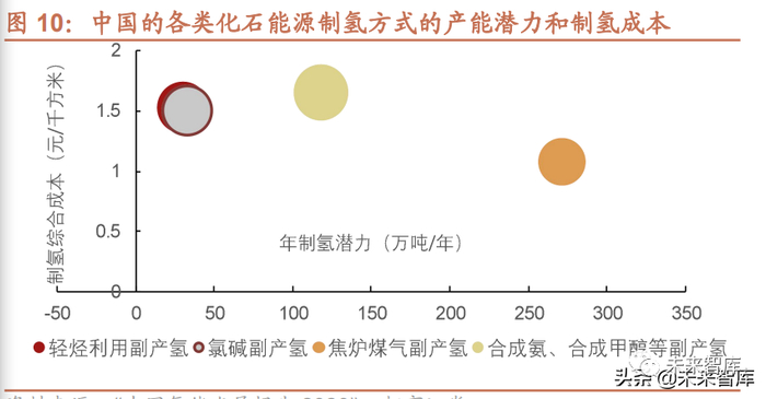 从煤制氢的角度来看,中国当前通过煤化工的方式制氢的手段已经比较成熟,生产方式主要为煤气化炉利用变压吸附 (PSA)技术提纯到燃料电池用氢需求。煤制氢对于资源的密集度和投入规模都有 要求,在煤炭资源丰富的地区,煤炭价格可能低至 200 元/吨,这种情况下煤制氢成本大约 6.77 元/kg,而当煤炭价格 涨至 1000 元/kg 时,煤制氢成本会达到 12.14 元/kg。此外煤制氢项目一般初期投入巨大,单位投资成本在 1~1.7 万 元/(千方米/小时),因此只有大规模生产的条件下,才能有效摊薄资本投入。(报告来源:未来智库)