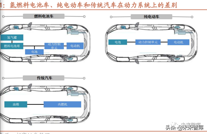 有鉴于此,氢燃料电池相比纯电动车,车体存在真实的供能装置,而纯电动车仅仅是依靠外部供电转化为蓄电池内部 储存的化学能,使用时转化为电能,这也使得氢燃料电池无需像纯电动车一样背负庞大的电池系统以保证续航,车载 储氢瓶内的氢气能直接用于产生电能,驱动电机运转。因此在这个视角上,氢燃料电池不仅和传统油车一样,加氢加 油极为快捷(纯电动车充电效率慢得多),且因存在直接供能装置,因此续航也多有保证(相反对于纯电动车,锂电 池的能量密度已经扩大到很高的位点,继续向上突破往往意味着放弃安全性,因此承载较大电池系统的车辆往往难以 长距离续航行驶)。