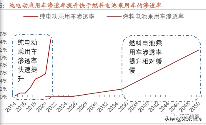 尽管未来乘用车成本会下降到与锂电池车近似的水平,但制约乘用车推广的重要因素在于氢燃料电池车最初的推广便 是车规级的,缺少其他低层级消费品的消费铺垫(如智能手机、电瓶车在早年的市场发展)以及缺少基础设施的支撑 (需要大量加氢站才能形成规模效应,而锂电池车本身的充电过程就可以依赖电网基础),因此未来氢能源燃料汽车 的增长虽是大势所趋,但其渗透率的提高可能相对缓慢,纯电动乘用车的渗透率从 2015 年的 1%上升到 2021 年截至 10 月的接近 15%的水平。(报告来源:未来智库)