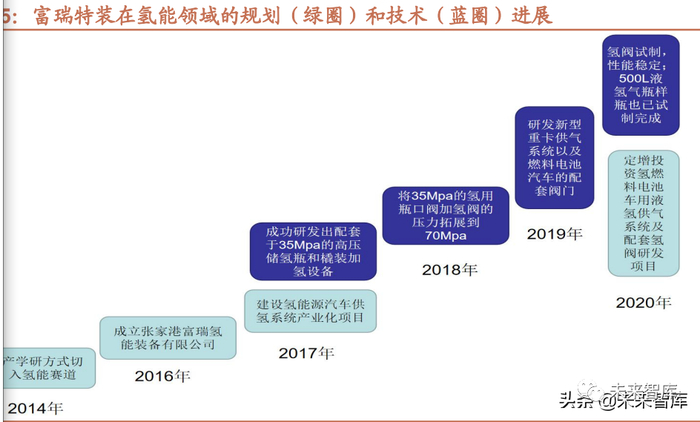后续年度,公司在 2017 年技术积累的基础上,进一步将 35Mpa 的氢用瓶口阀加氢阀的压力拓展到 70Mpa,进展迅 猛。2019 年,除加氢站用氢阀外,公司进一步研发基于液氢技术下的新型重卡供气系统以及燃料电池汽车的配套阀 门。截至 2020 年,公司的全系列氢阀已经在国内主要整车企业开展广泛路试,性能稳定;2019 年进入研发的车载供 氢系统已经实现试制,并针对密封问题作出改进设计完成新一代 HPDI 气瓶,此外针对该系统的 500L 液氢气瓶样瓶 也已试制完成;燃料电池车配套氢用阀门亦在持续研发中。
