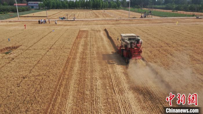 中新网邯郸6月18日电 (王天译 王喜民)三夏时节,河北邯郸大地一片金黄。17日上午,在邯郸曲周县槐桥乡西漳头村,种植户任景河正驾驶着联合收割机穿梭田间收获小麦。收割现场,经邯郸市和曲周县农业部门专家实收测产,这块试验田平均亩产小麦554公斤。