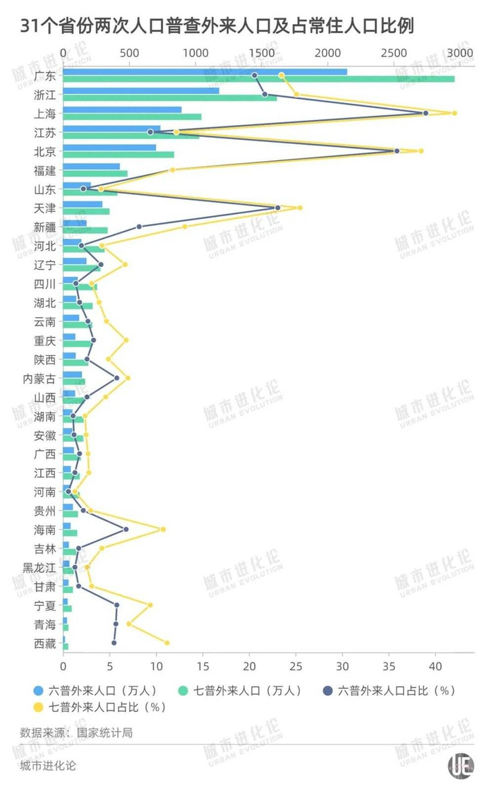 事实上,从2010年到2020年,31个省份的外来人口占常住人口比重都在上升,最多的是西藏,占比提高5.6%,最少是福建,增加0.1个百分点。