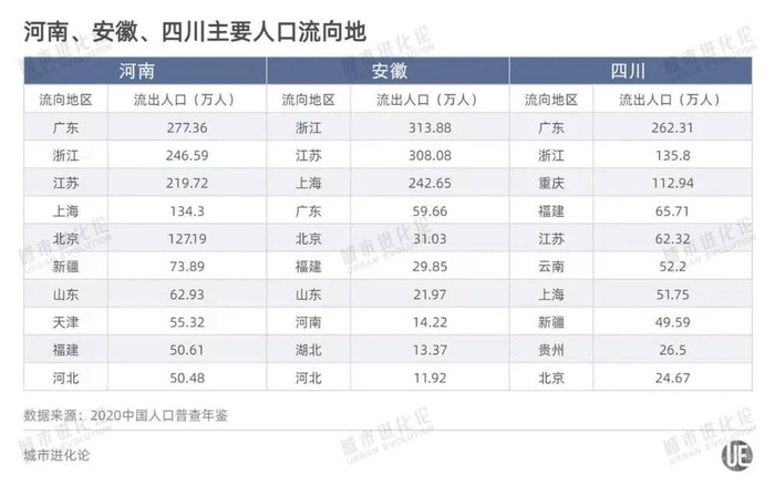 而2010年六普时,流动人口“供给端”的第一名是安徽(962.26万人),四川第二(890.51万人),河南列第三(862.62万人)。它们也是当时唯三人口流出超过800万的省份。