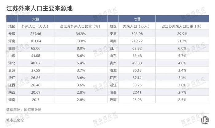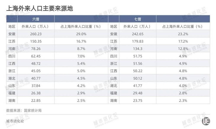 再看江浙沪,外来人口规模相当,都在1000万人左右,并且“吸入”最多的都是安徽人。