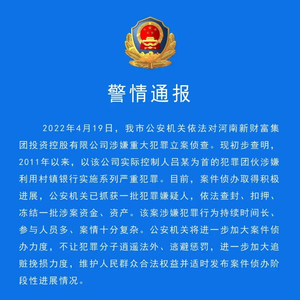 据平安许昌微信公众号消息:2022年4月19日,许昌市公安机关依法对河南新财富集团投资控股有限公司涉嫌重大犯罪立案侦查。