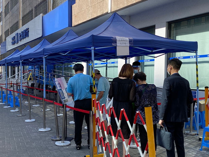 上海银保监局发出通知后,这家银行再次作调整,取消了每天放号的数量限制,只要扫“场所码”显示核酸报告在72小时有效期内,并且体温正常,都可以随到随入,从在银行外等候变为在银行内等候。