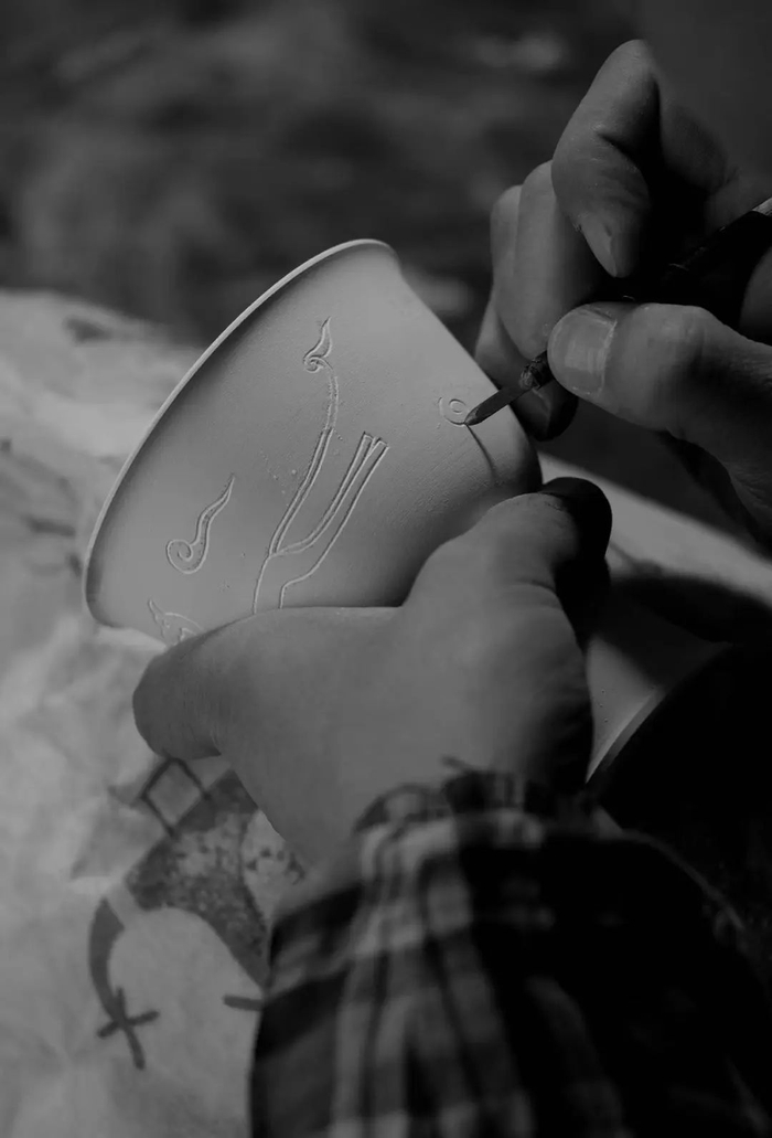 刘振桓在成为制瓷匠人之前,从事书法专研,深谙书家“篆尚婉而通”,后将笔力的婉转通畅、刚毅明快的阴阳调和关系运用到瓷型设计和制作中。
