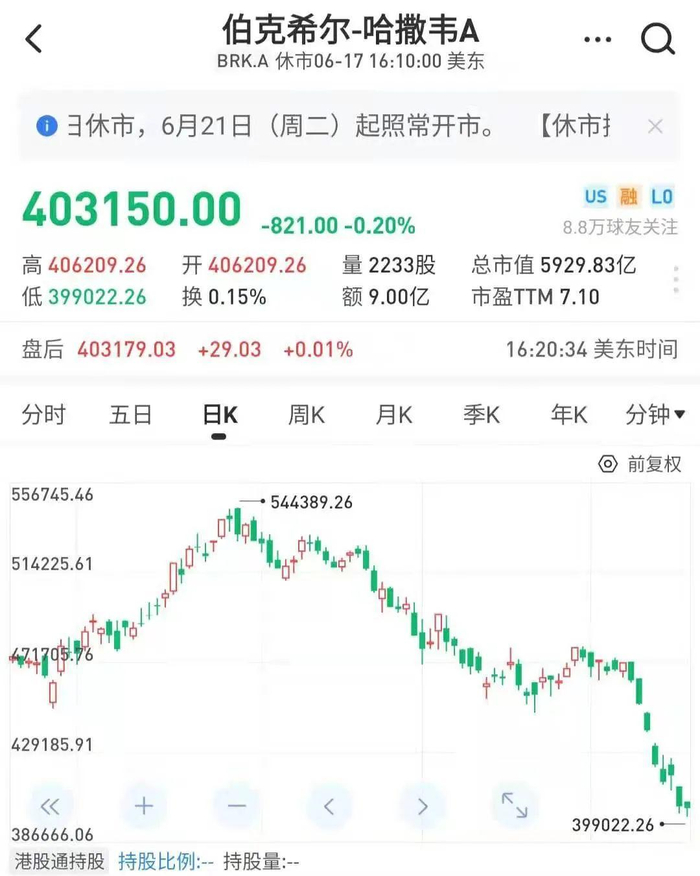截至6月13日,伯克希尔-哈撒韦的股票投资组合在二季度遭受了650亿美元(合4378亿人民币)的损失。伯克希尔-哈撒韦A的股价也从3月29日的544389美元大幅下跌至6月17日的403150美元,3个月不到跌幅已高达近26%。