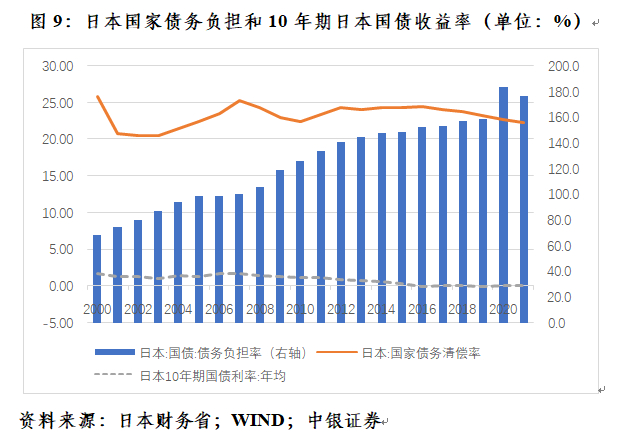 日债收益率飙升还将威胁增加日本政府的偿债负担。低通胀、低利率是央行为政府赤字融资,践行现代货币理论(MMT)的重要前提。2021年底,日本国债债务负担率为177%,较2012年底上升35.8个百分点,国家债务清偿率却由24.3%降至22.3%。这主要是因为自2013年以来,日本央行实施量化质化宽松货币政策,引入负利率和YCC(见图9)。可以预见,若YCC破防,日债收益率将非线性上升。而日债收益率每升高1个百分点,则意味着日本政府将多用约相当于去年财政收入的10%支付国债利息。