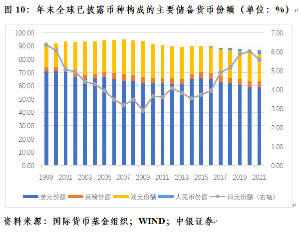 由此引发的冲击将远超日元贬值,波及范围也不会仅限于亚洲地区。如亚洲金融危机爆发后,全球已披露币种构成的日元储备份额一度回落,但2015年起重新回升,2017~2021年日元份额平均为5.51%,较2012~2016年提高1.68个百分点(见图10)。这反映了近年来国际社会外汇储备资产多元化配置的努力,但也意味着外国官方投资者更多暴露于日债收益率波动的风险之下。此外,日本央行放弃YCC,还可能加剧市场紧缩预期,触发日元利差交易平仓,引爆新的全球金融动荡。届时,短期内日元汇率有可能不跌反涨。