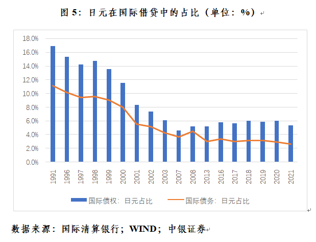 从国际借贷(包括债券和信贷)看,国际债权中,1996年底,日元占比为15.3%,到2021年底降至5.4%,下降9.9个百分点;国际债务中,日元占比由10.1%降至2.6%,回落7.5个百分点(见图5)。虽然其他亚洲货币尚不能在这方面挑战日元的地位,但日元份额下降依然较多。长期以来,日元是利差交易的主要融资货币,投资者借低息日元购买其他币种的高息资产。通常,日元降息、贬值利好这种利差交易,加息、升值才是利空。1997年泰铢被攻击的一个重要背景是,日元升息传闻引发了日元利差交易的平仓。