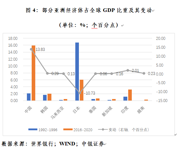 从经济体量看,亚洲危机之前的1992~1996年,日本在全球的份额平均为16.8%,到2016~2020年降至6.1%,下降10.7个百分点。同期,中国的份额由2.1%升至15.9%,上升13.8个百分点,其他亚洲经济体占比也大都有不同程度的升幅(见图4)。