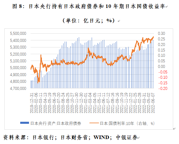 由于全球重回高通胀时代,越来越多的央行开启了货币紧缩进程。尤其是因为通胀“暂时论”“见顶论”破产,美联储加快了升息和缩表步伐,6月份议息会议28年来首次加息75个基点。相对而言,日本通胀虽有所抬头但总体温和,加之日本深受通货紧缩、经济停滞之苦,故日本央行继续实施国债收益率曲线控制(YCC,即将10年期日债收益率控制在0左右且容忍其波动±0.25%)政策,支持经济复苏。本周议息会议再次确认了这一政策立场。