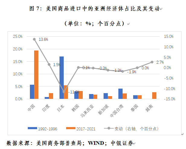 从美国进口商品构成看,1992~1996年,日本占比平均为17.0%,2017~2021年降至5.4%,下降11.6个百分点。同期,中国占比由5.7%升至19.3%,上升13.6个百分点,其他亚洲经济体占比有升有降(见图7)。可见,即便在第三方市场上,日本也非其他亚洲经济体的主要竞争对手。