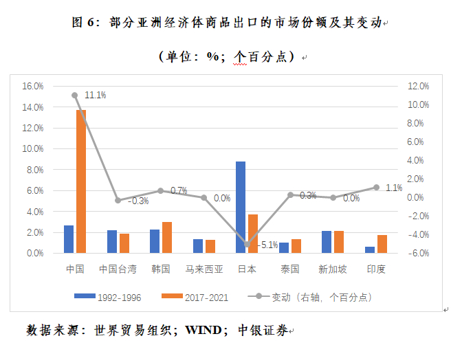 从全球商品出口市场份额看,1992~1996年,日本占比平均为8.8%,2017~2021年降至3.7%,下降5.1个百分点。同期,中国占比由2.6%升至13.7%,上升11.1个百分点,其他亚洲经济体占比也大都有不同程度的升幅(见图6)。日本在全球贸易格局中地位显著下降,减轻了日元急跌引发的亚洲货币竞争性贬值压力。