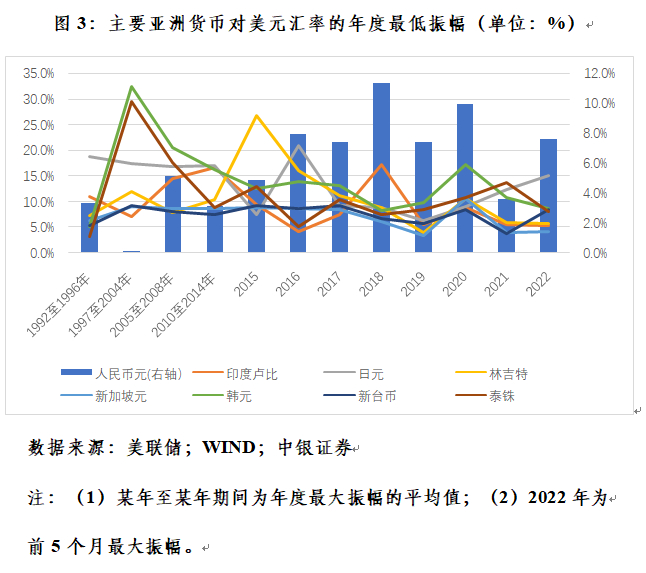 亚洲危机后日元汇率的影响力总体趋于减弱,得益于其他亚洲货币的汇率弹性增加。2005~2021年(“7·21”汇改以来),人民币、卢比、林吉特、新加坡元、韩元、新台币、泰铢年度汇率最大振幅均值较1992~1996年分别上升2.1、1.6、3.2、1.8、10.5、2.2、8.1个百分点(见图3)。这有助于发挥汇率浮动吸收内外部冲击的“减震器”作用。