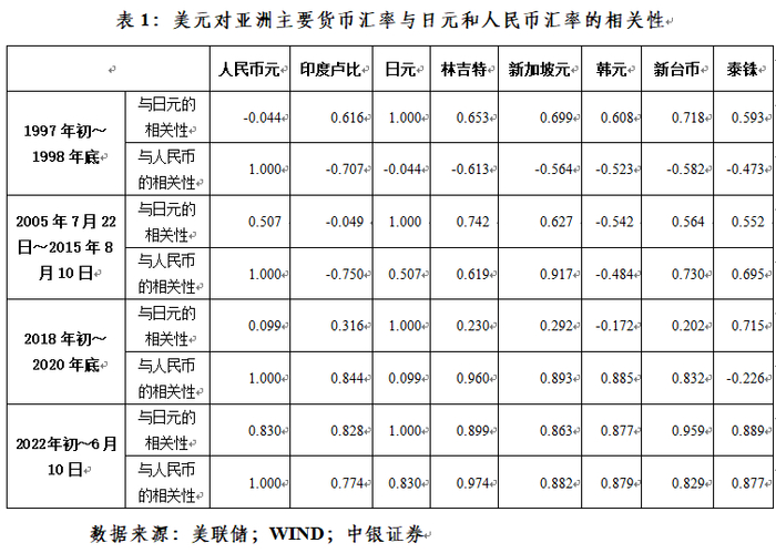 但危机之后,前述相关性有所变化。对2005年7月22日(“7·21”汇改以来)~2015年8月10日(“8·11”汇改前夕)的数据做类似处理后显示,人民币与日元为较强正相关。同期,林吉特、新加坡元、新台币、泰铢与日元均为较强的正相关,但与亚洲危机时相比,正相关性减弱,卢比、韩元与日元甚至转为负相关;除卢比、韩元与人民币继续为较强的负相关外,林吉特、新加坡元、新台币、泰铢与人民币均转为较强或者高度正相关。这表明亚洲危机后,其他亚洲货币与日元、人民币的联动性此消彼长,其中新加坡元、新台币、泰铢与人民币的正相关性明显高于与日元的相关性(见表1)。