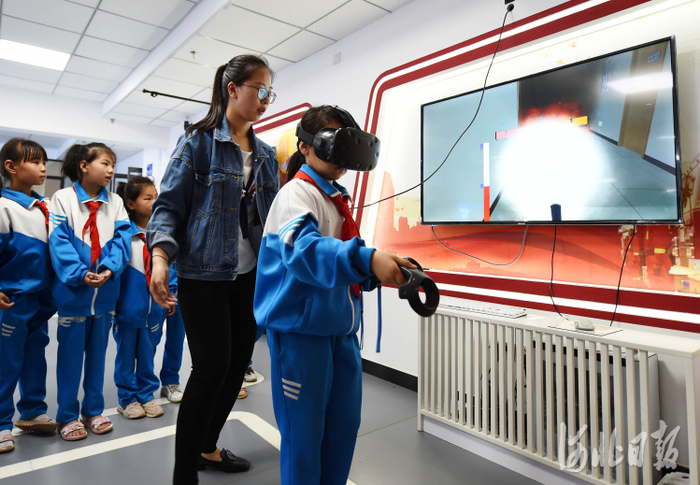 近日,河北盛世博业科技有限公司工作人员在指导邢台开发区赵麻村小学的学生通过VR地震、火灾逃生系统演练逃生。河北日报记者 赵永辉摄