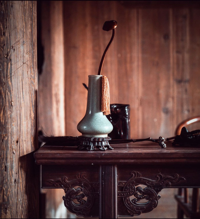 挂画也选用了嘉靖时期吴门画家仇英的作品。还有一些陈设的小件古董器物如宣德炉、水晶双耳杯,黄釉瓜棱瓶等都是当时吴中文人喜好的清玩雅物,也是空间里的点睛之笔。不仅如此,他还要求这些物件要有使用感和时间痕迹,让人一看就能感受到生活烟火气,而非走进了一间明式家具陈列中心。
