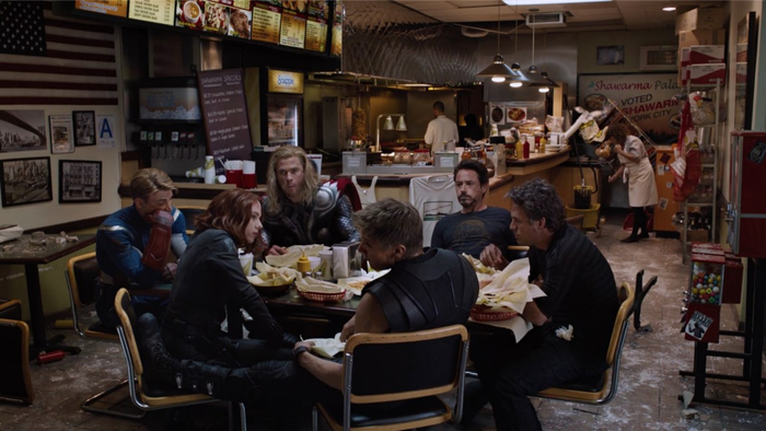 这是一个据说在2012年国内公映时删掉的结尾彩蛋。超级英雄们在疲惫地战斗后,于小吃店里补充些能量。虽然没有一句台词,却有人性的幽默感。有时,这些闲笔小段反而更接近“电影”,而不是娱乐。