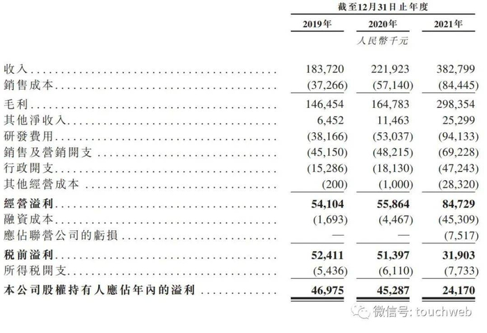 招股书显示,微创脑科学2019年、2020年、2021年营收分别为1.84亿元、2.22亿元、3.82亿元;毛利分别为1.46亿元、1.65亿元、2.98亿元。