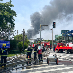 6月18日上午,《每日经济新闻》记者赶到涉事工厂附近,仍能看到黑色浓烟,并闻到刺激性气味,周边已有多部消防车辆和众多消防员,靠近核心区域的多条道路已被实施交通管制。距离事故发生地相对较近的居民楼和办公室,有不少窗户玻璃被震碎,地上散落着玻璃碎片。