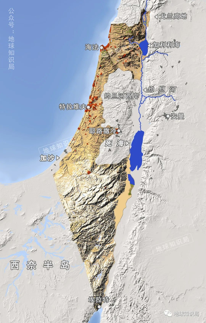 以色列地处地中海沿岸,根据地形地貌特征,可划分为海岸平原、中部丘陵、约旦河谷和内盖夫沙漠四大地理区域。其中,仅南部的内盖夫沙漠面积就有1.6万平方千米,约占以色列国土面积的73%,给以色列盖上了一层厚厚的“吸水棉被”。