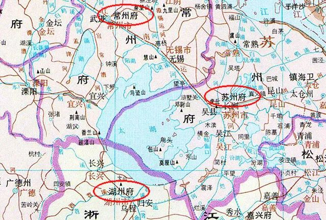 跟历史上的太湖分治相比,依然是三州临湖,由无锡代替了常州的位置,湖州却已和太湖“绝缘”。