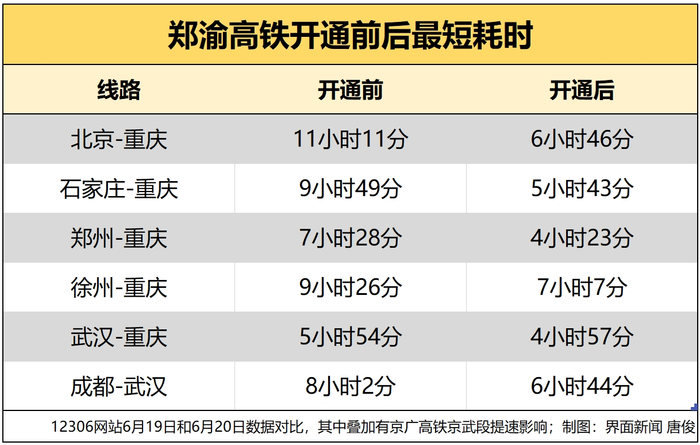 此前,北京到重庆的高铁列车耗时11小时11分,现在只需6小时46分;石家庄至重庆高铁的耗时由9小时49分缩短至5小时43分,郑州至重庆的耗时由7小时28分缩短至4小时23分。