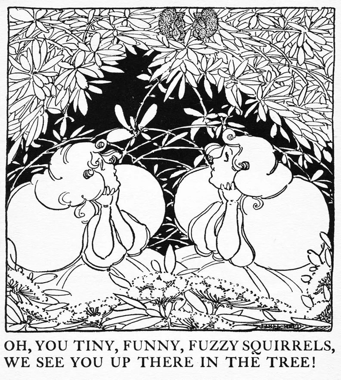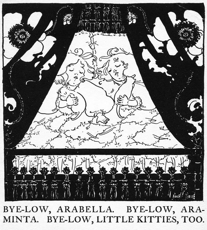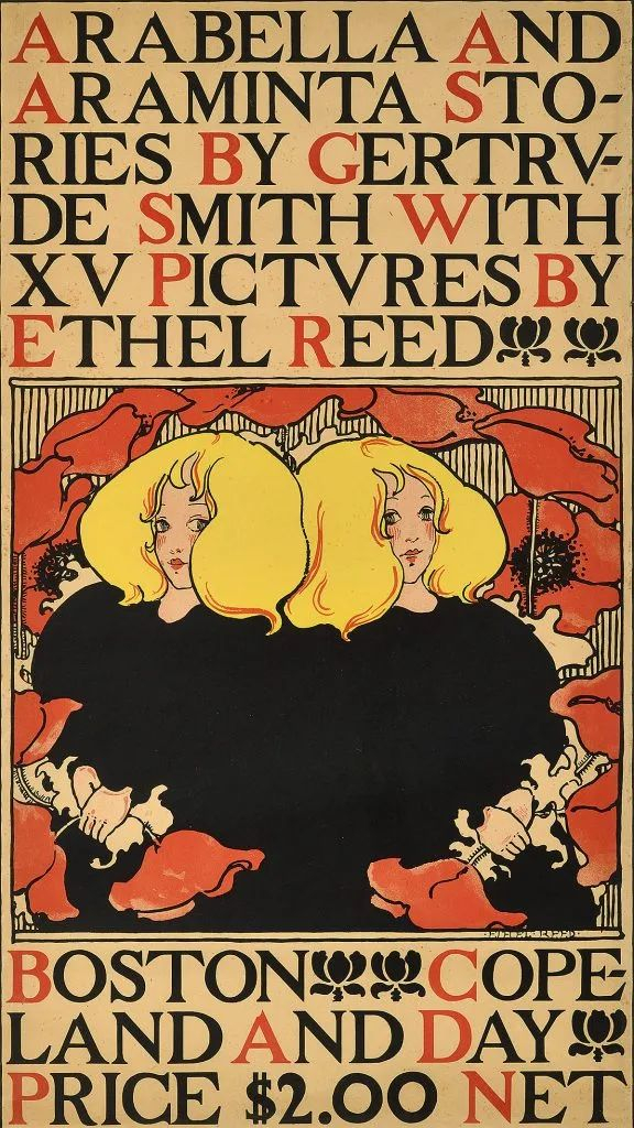埃塞尔为《阿拉贝拉和阿拉明塔的故事》设计的海报,选择黑红相间的字体,与中心图案呼应。海报中央的金发双胞胎看似是镜像,但表情具有细微差别,暗示着她们不同的个性。/1895 年由 Copeland & Day 出版