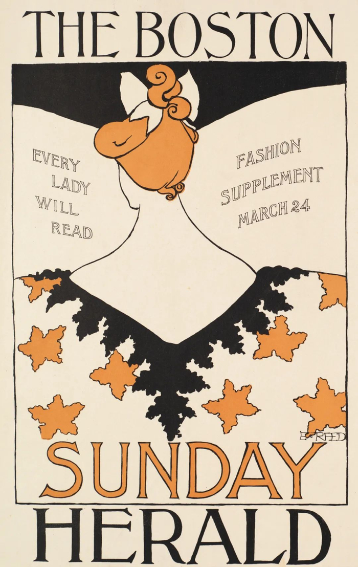 埃塞尔为 1895 年 2 月 24 日发行的《波士顿星期日先驱报》绘制的海报,有强烈的平面感,描绘一个优雅女性正在阅读报纸,背景是三朵罂粟花。